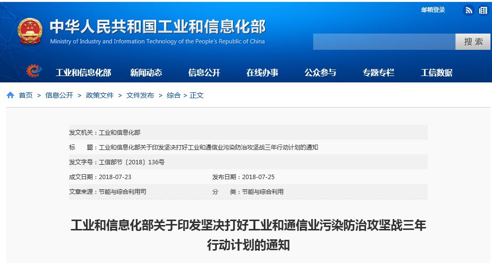 7月25日,工業和信息化部發布《堅決打好工業和通信業污染防治攻堅戰三年行動計劃》。行動計劃旨在全面推進工業綠色發展,堅決打好污染防治攻堅戰,促進工業和通信業高質量發展。